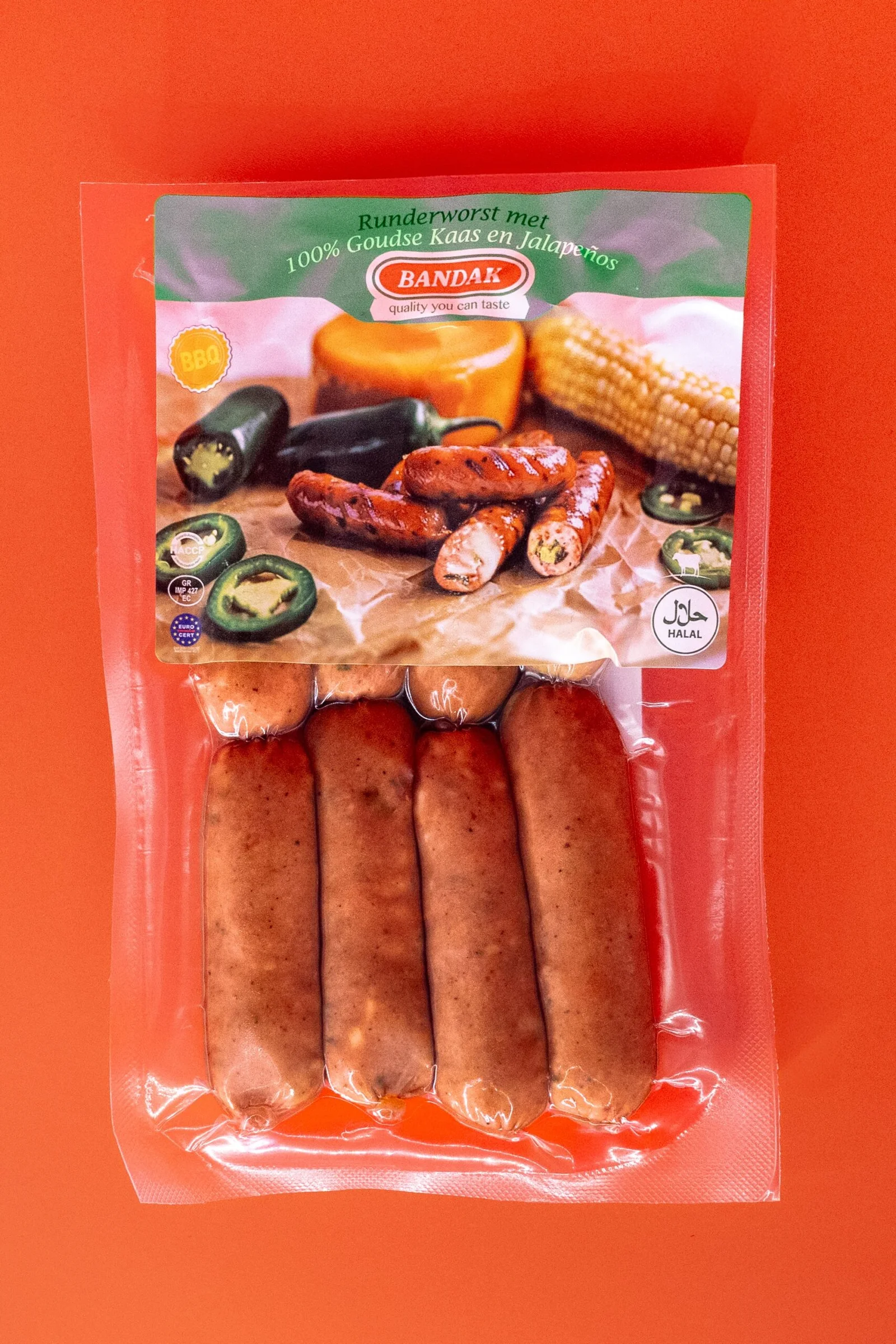Bandak Cheesy Jalapeño rundworstjes: premium rundvlees, romige kaas en pittige jalapeño voor een smaakexplosie. Perfect voor elke gelegenheid!